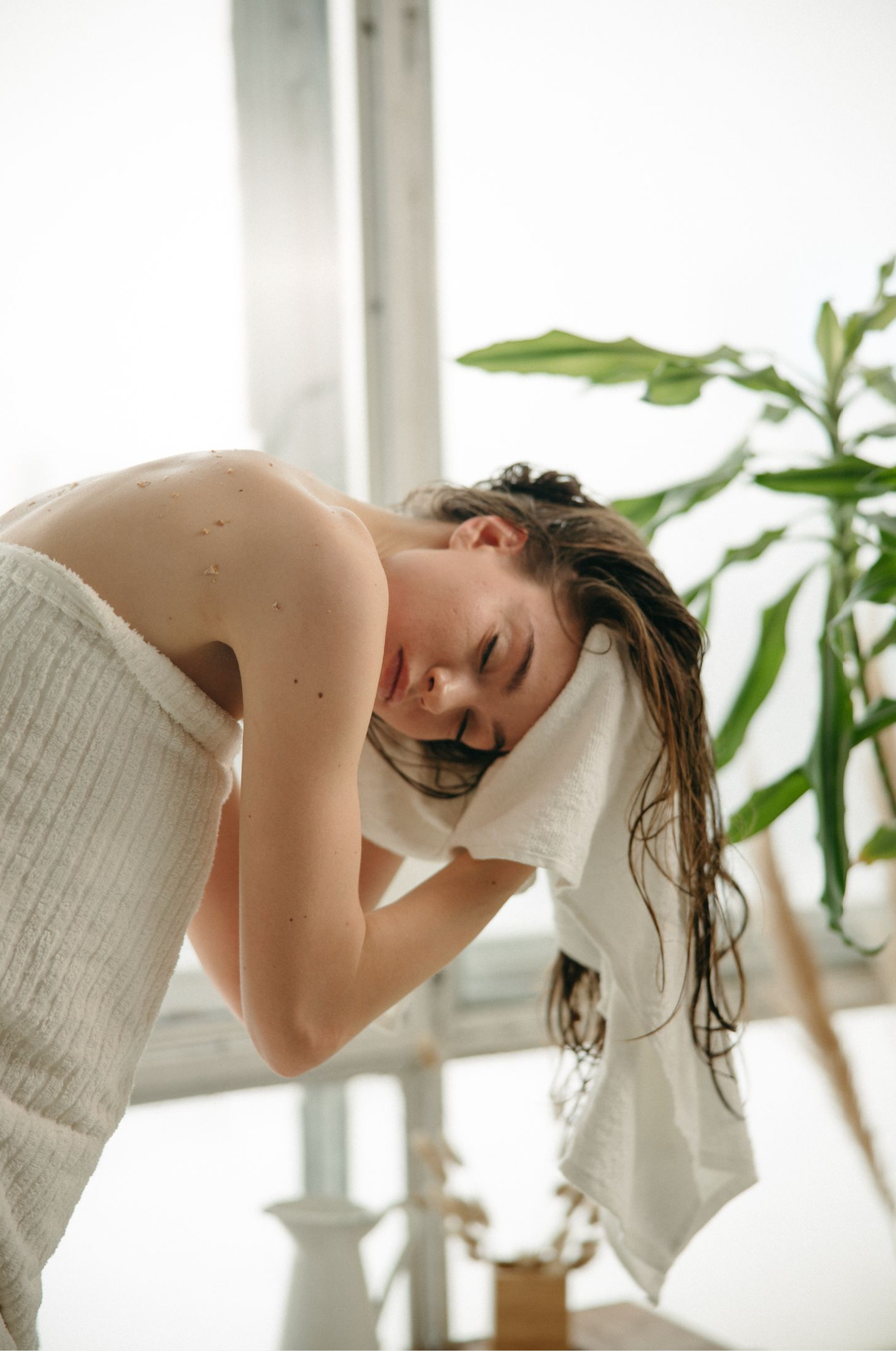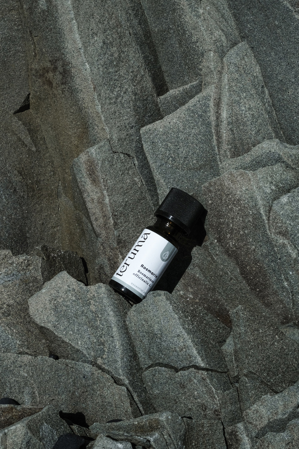 Kopfhautmassage: Mische 5 Tropfen teruma ätherisches Rosmarinöl mit 10 ml Kokosöl und massiere es in die Kopfhaut ein.